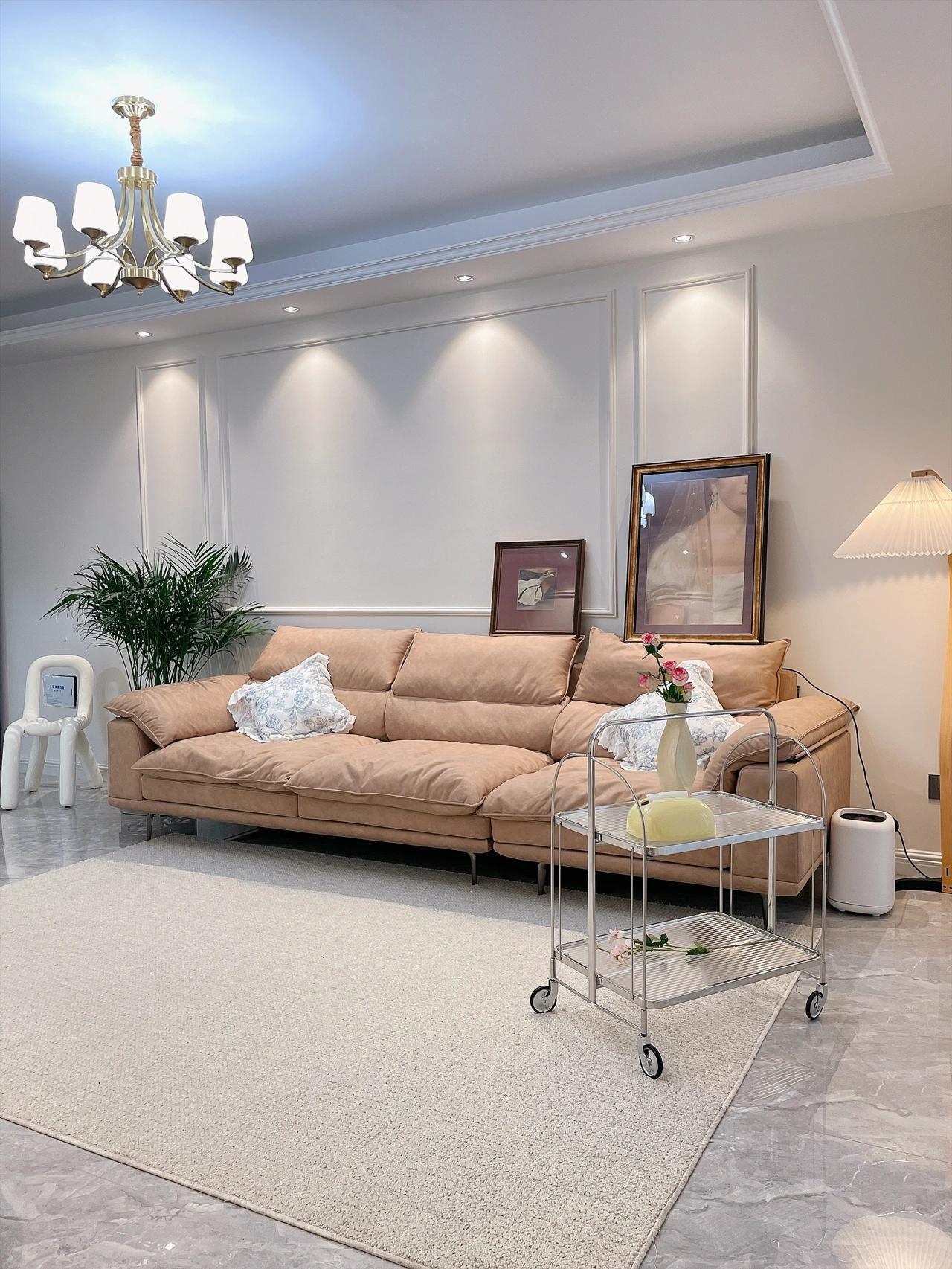 设计师通常会选择一块大尺寸的长毛地毯,铺满沙发前的区域,既可以保护地面,又能带来柔软舒适的脚感。
