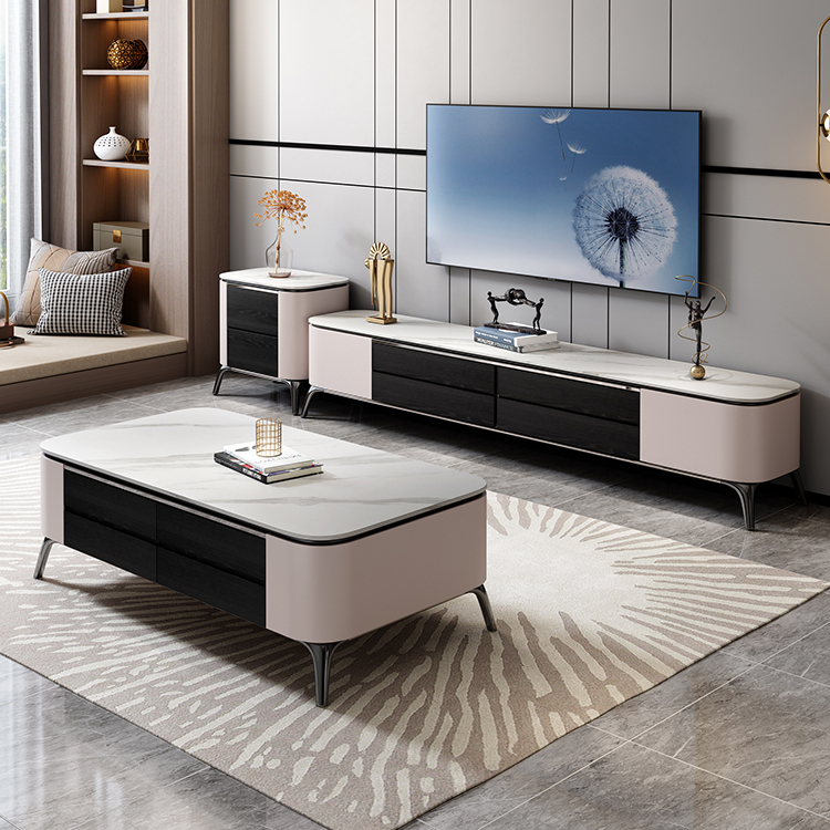 在选材上,可以与茶几做些区分,比如采用金属、藤编等轻巧材质,搭配极简风格的几何造型,让边柜成为点睛之笔。