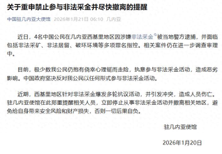 1月21日,中国驻几内亚大使馆发布《关于重申禁止参与非法采金并尽快撤离的提醒》: