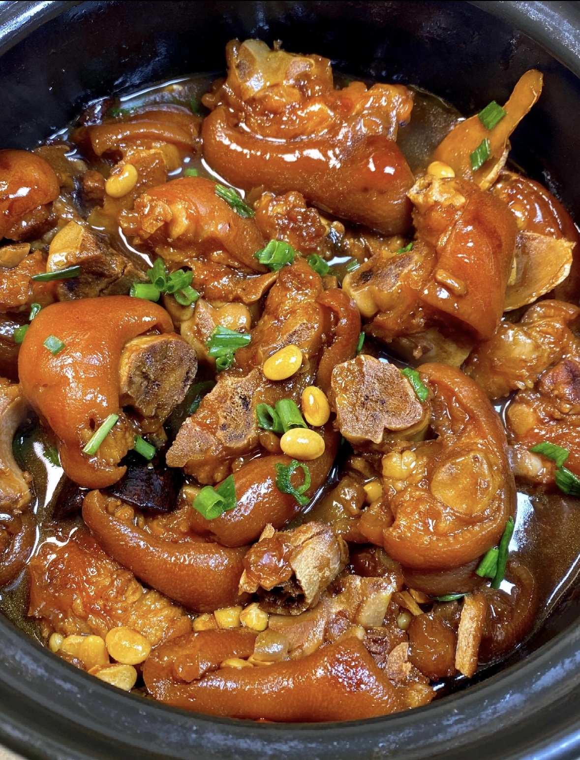 黄豆是隐藏彩蛋。提前一晚冷水泡发,圆滚滚像小胖子,炖到半程时下锅,吸饱肉汁后变身“素鲍鱼”。我爸说:“黄豆是海绵,汤里精华全吸进去,一口咬下去,会爆汁。”果然,最后半小时黄豆入场,砂锅再次沸腾,泡泡里带着豆香,我妈在客厅喊:“别煮啦,再煮邻居要报警!”我爸才恋恋不舍地大火收汁,汤汁从清亮收到挂勺,像巧克力酱一样浓稠,撒一把翠绿小葱花,红亮亮的猪蹄顶着“绿帽子”出锅,场面极度诱人。