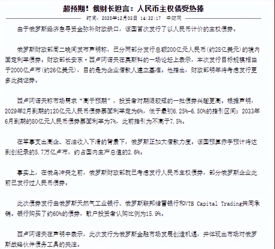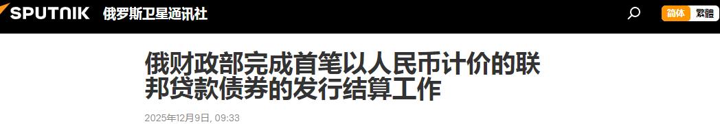 这一刻,西方才真正看懂了“静悄悄的变革”,事情的引爆点出现在12月8日,俄罗斯财政部搞了个大动作,完成首笔以人民币计价的联邦贷款债券发行结算。