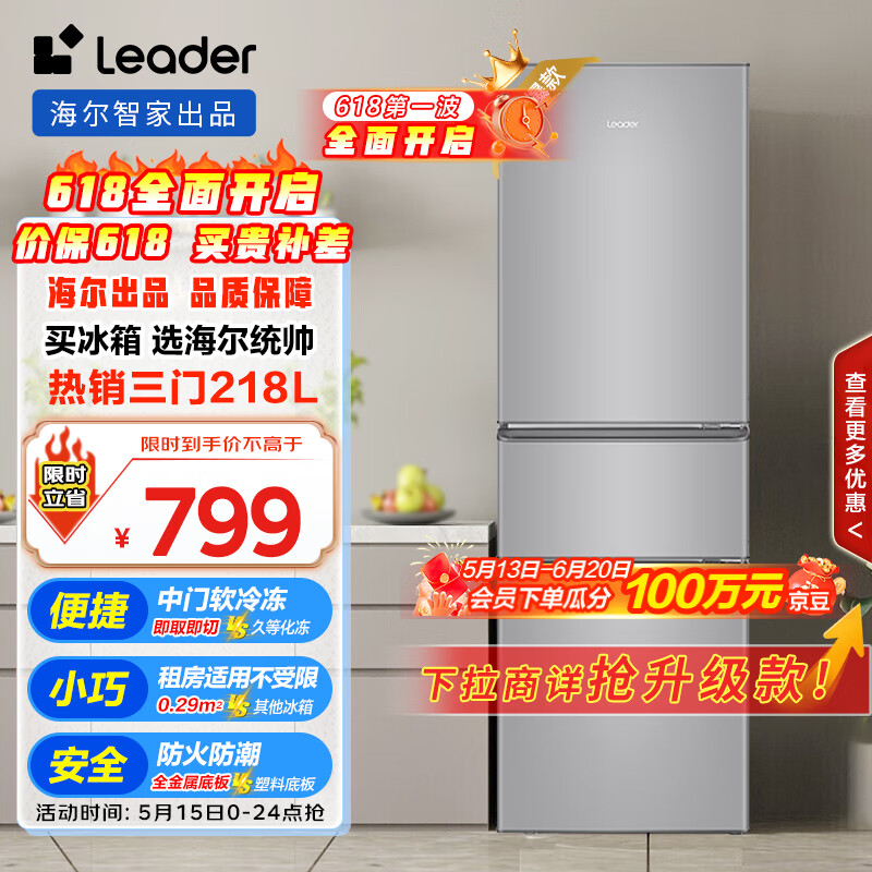 统帅(Leader)海尔218升三开门三温区租房家用小型中门软冷冻超薄节能小冰箱BCD-218LLC