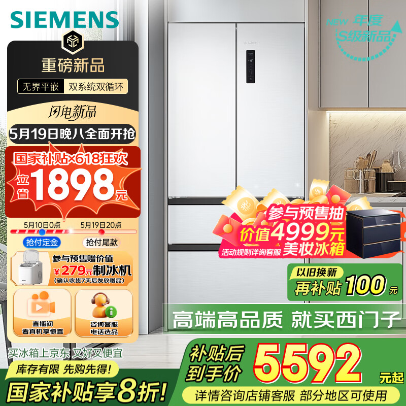 西门子(SIEMENS)504L无界平嵌法式多门双循环冰箱 超薄嵌入式零嵌四开门 一级能效 晶耀BC