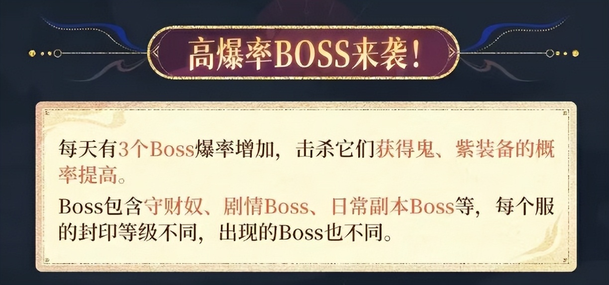 诶锻造装备的动力和buff都有了,那还缺少什么呢?那当然就是装备啦!官方这回也是非常贴心地给那些BOSS也来了一次“概率UP”!活动期间,每天有3个BOSS爆率增加,击杀它们获得鬼、紫装备的概率提高,官方这是生怕玩家穿不上好装备啊!而且参加上面这些活动还能够获得积分,冲击排行榜,获得超级大奖,重赏之下,必然群情踊跃!