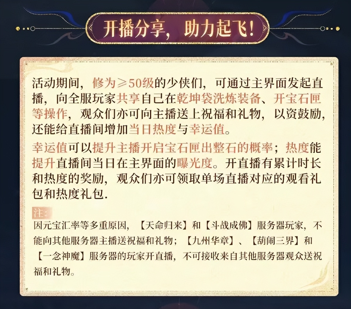 闭门造车不如群策群力,活动期间,等级大于50级的玩家在乾坤袋洗炼装备、开宝石画等操作,可以向全服务器开启直播,展示自己“百炼成器”的过程,而其他的玩家则可以向主播送上祝福和礼物,提升对方的幸运值和热度,幸运值还能够提升主播开启宝石匣出整石的概率!而且无论是开启直播还是观看直播,累计时长都可以获得奖励,如果有人能够锻造出极品神装,必然是万众瞩目!