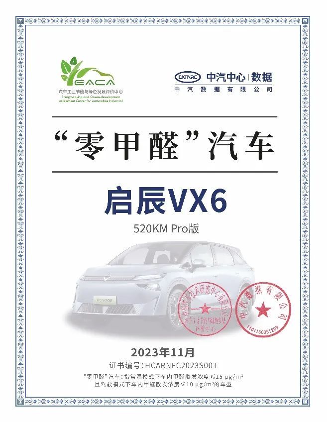 而面对一台空间宽敞舒适,智能化体验出色的产品,大家自然更愿意长时间待在车里,那么我们对座舱环保自然会有更高的要求。启辰VX6大平层作为中汽中心首批公布的“零甲醛”汽车,甲醛含量比国标限值的五分之一还要低,也就是说和室外环境空气没有什么差异。