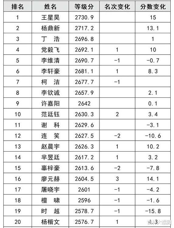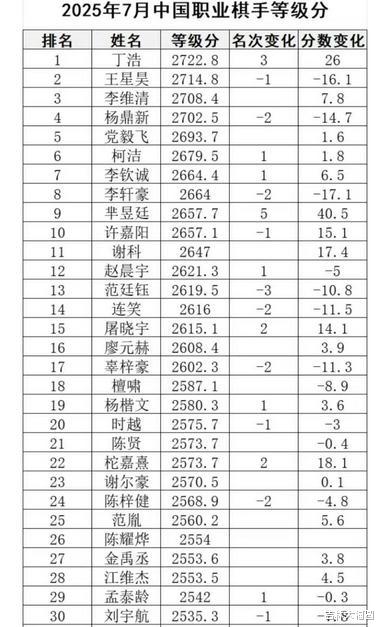 2025年7月份,丁浩九段以2722.8分力压王星昊九段成为新的中国等级分第一人。多年以前,丁浩九段是号称“皇太子”,王星昊九段号称“皇太孙”。