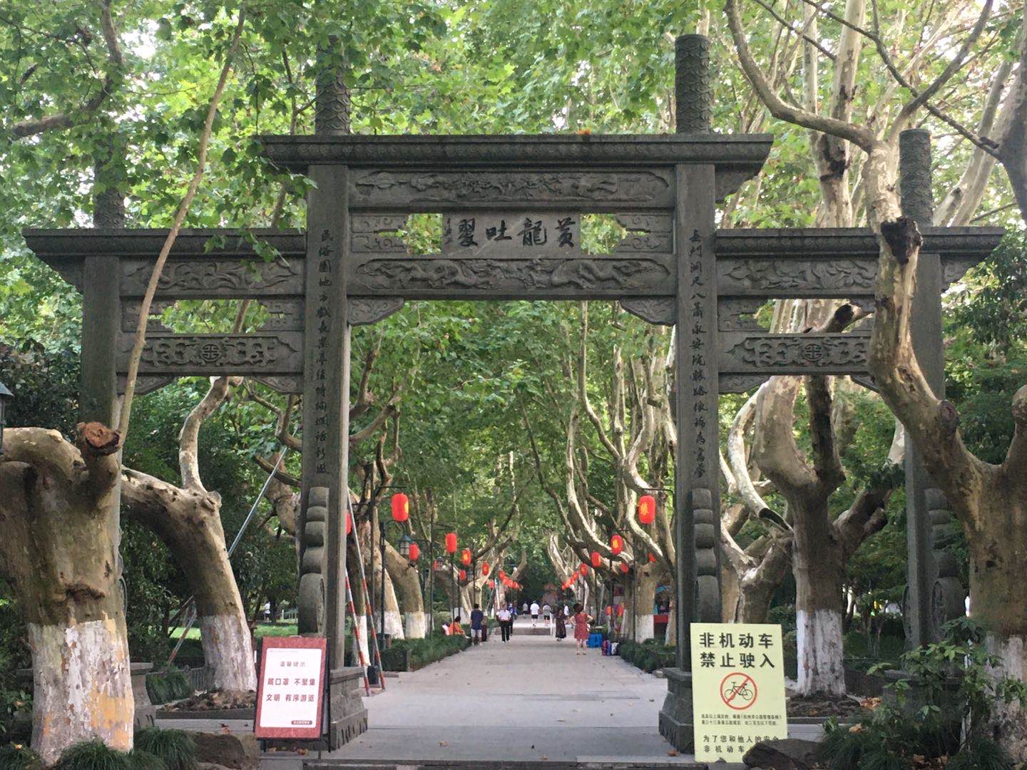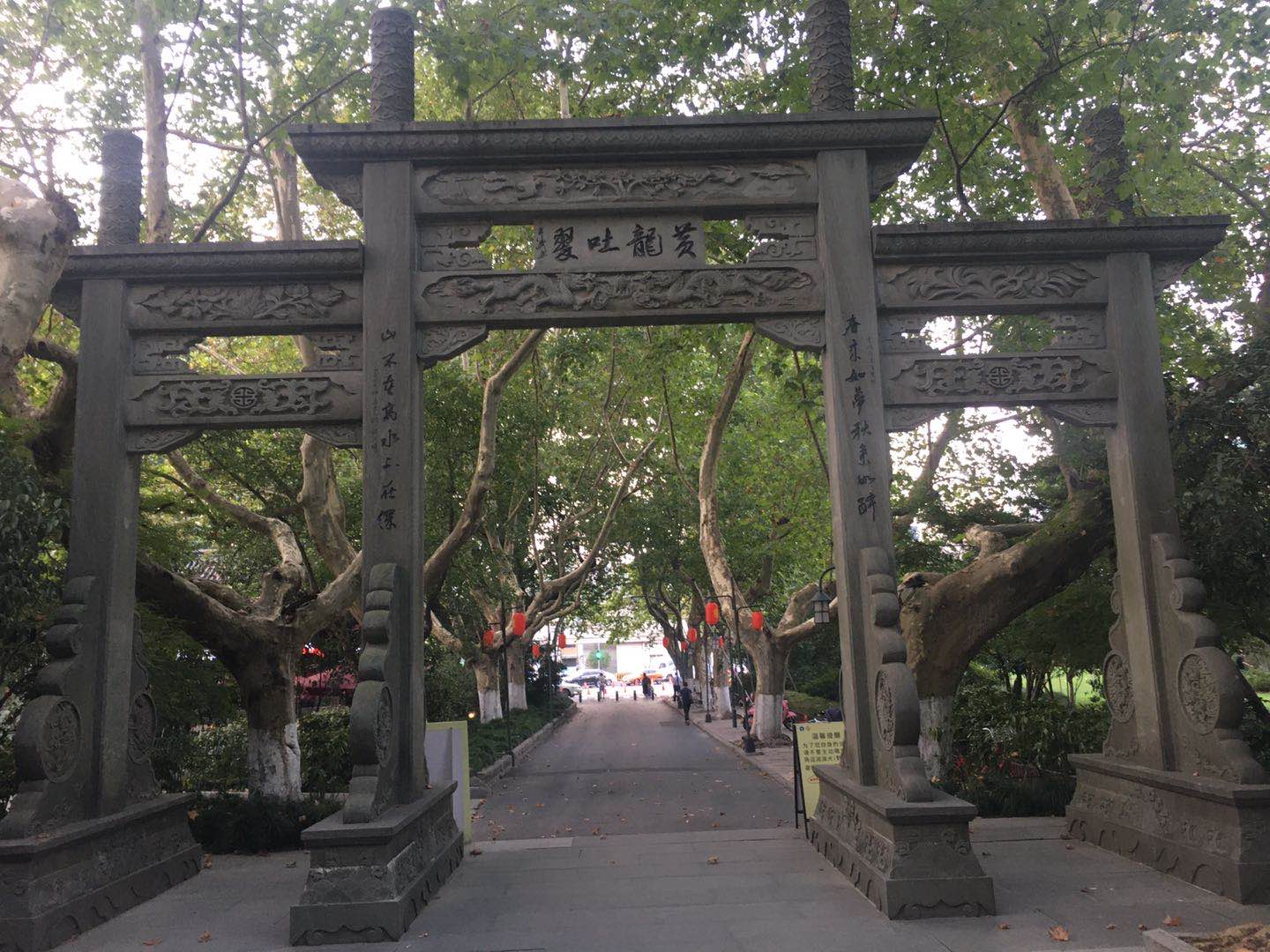 从曙光路(陈经纶体校对面,靠近浙江图书馆和黄龙体育中心)进入,先是看到一则石质牌坊,上书“黄龙吐翠”四个大字,右联“无门洞尽八箫永安院胜迹依稀寻旧梦”,左联“民俗园地方戏长乐亭佳时绚烂话新风”。右联中无门洞指的是黄龙洞别称,尽八是一种箫类竹乐器,因其长一尺八寸,称之为尺八,永安院应指是的被誉为道教洞天福地”护国仁王院“。
