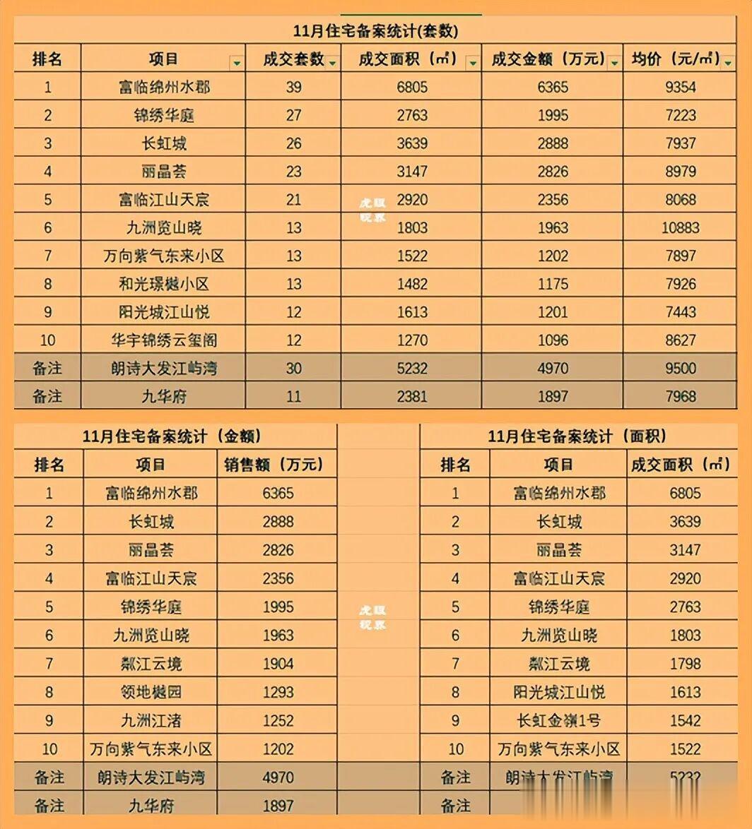接下来是锦绣华庭、长虹城、丽晶荟、江山天宸、览山晓、粼江云境、和光璟樾、领地樾园、金嶺1号、阳光城、九洲江渚、万向紫气东来等楼盘居于月度销售榜前列。
