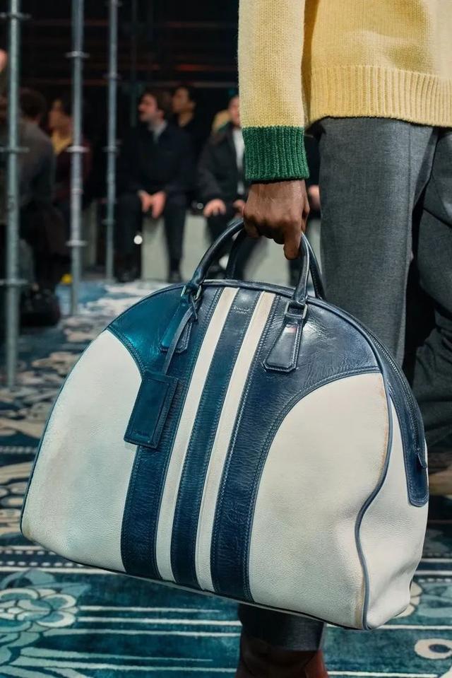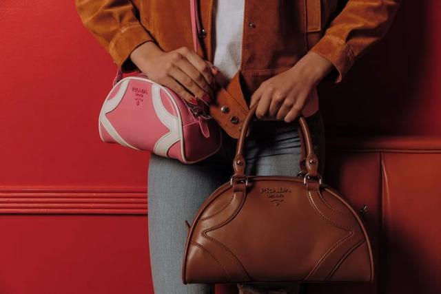1934 年,Louis Vuitton 以巴黎阿尔玛桥为灵感发布包袋 Alma,结合装饰艺术美学,形成了结构化圆顶和双手柄设计,并为「盒型包」廓形奠定基础 。尽管它并非直接为保龄球运动而生,但其造型已暗含对实用主义与优雅并重的设计思考。 今生: 保龄球包的符号重构 2000 年春夏,Prada 将 Bowling Bag 推上 T 台,以半圆线条、拱形手柄与对比色细节重塑功能美学,即使无法承载真球,却凭简洁廓形与精细皮革迅速俘获大众视线,确立「it-bag」地位。