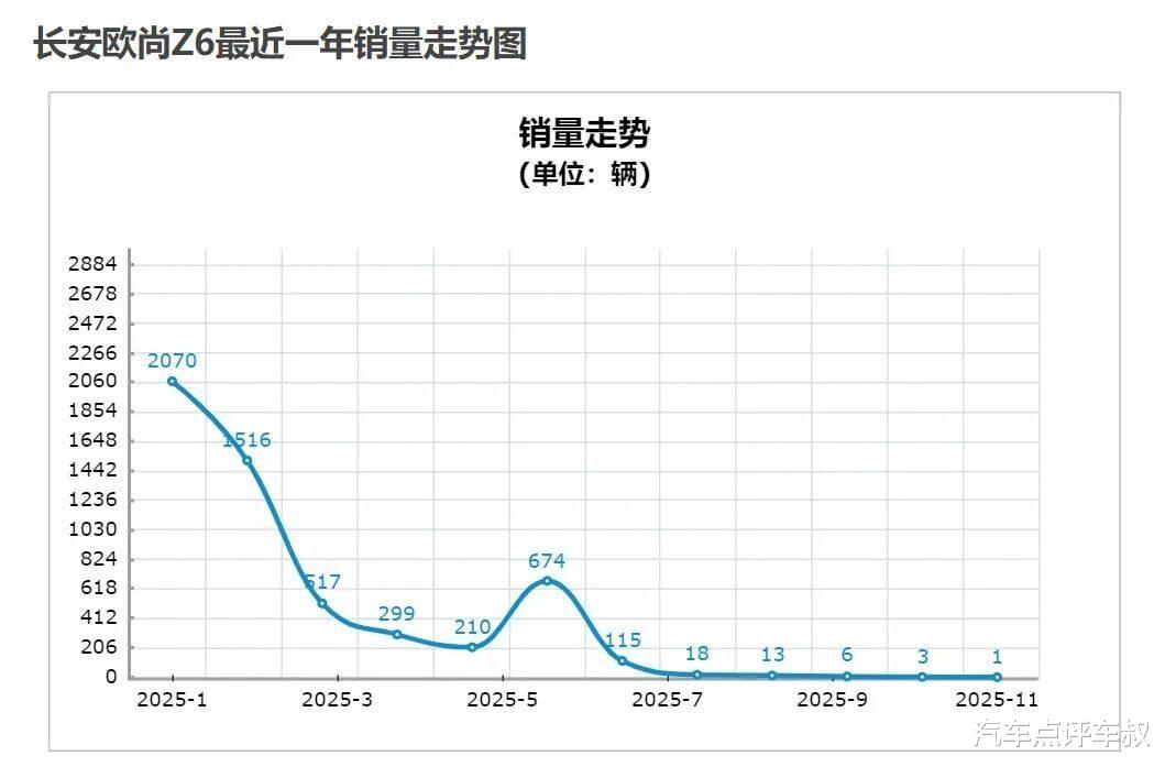 2025年11月,长安欧尚Z6的销量仅为1辆,1-11月份总销量也仅有3372辆。作为长安旗下欧尚品牌的一款紧凑型SUV,长安欧尚Z6曾以低于同级长安CS系列SUV的价格,提供了蓝鲸1.5T/2.0T动力、突出的智能化配置(如早期的“六屏联动”元宇宙概念)等亮点,也有过辉煌的销量历史。在2023年进入销售稳定期,2024年1月达到单月销量巅峰12176辆。然而,这种高速增长在2024年3月后戛然而止,并急速坠落,一路跌至今年11月的1辆,从月销过万到个位数,用了不到2年时间。