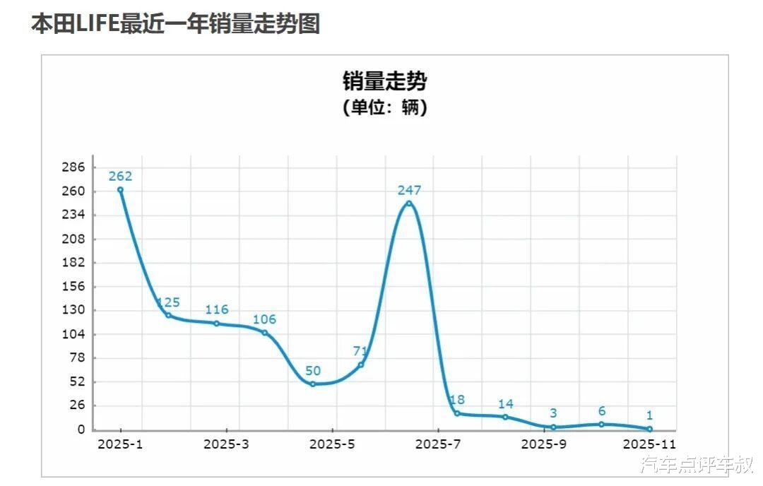 LIFE是东风本田旗下的一款小型轿车,官方指导价为9.78-11.28万元,即便目前本田给出最高可享2.30万元现金优惠,但销量依然惨淡。数据显示,自2023年1月以来,其月销量始终在2-3位数波动,而到了2025年11月仅卖出了1辆,今年1-11月累计销量也才757辆。作为本田飞度的姊妹车型,本田LIFE的陨落是传统燃油小车在新能源时代生存空间被急剧压缩的典型案例。
