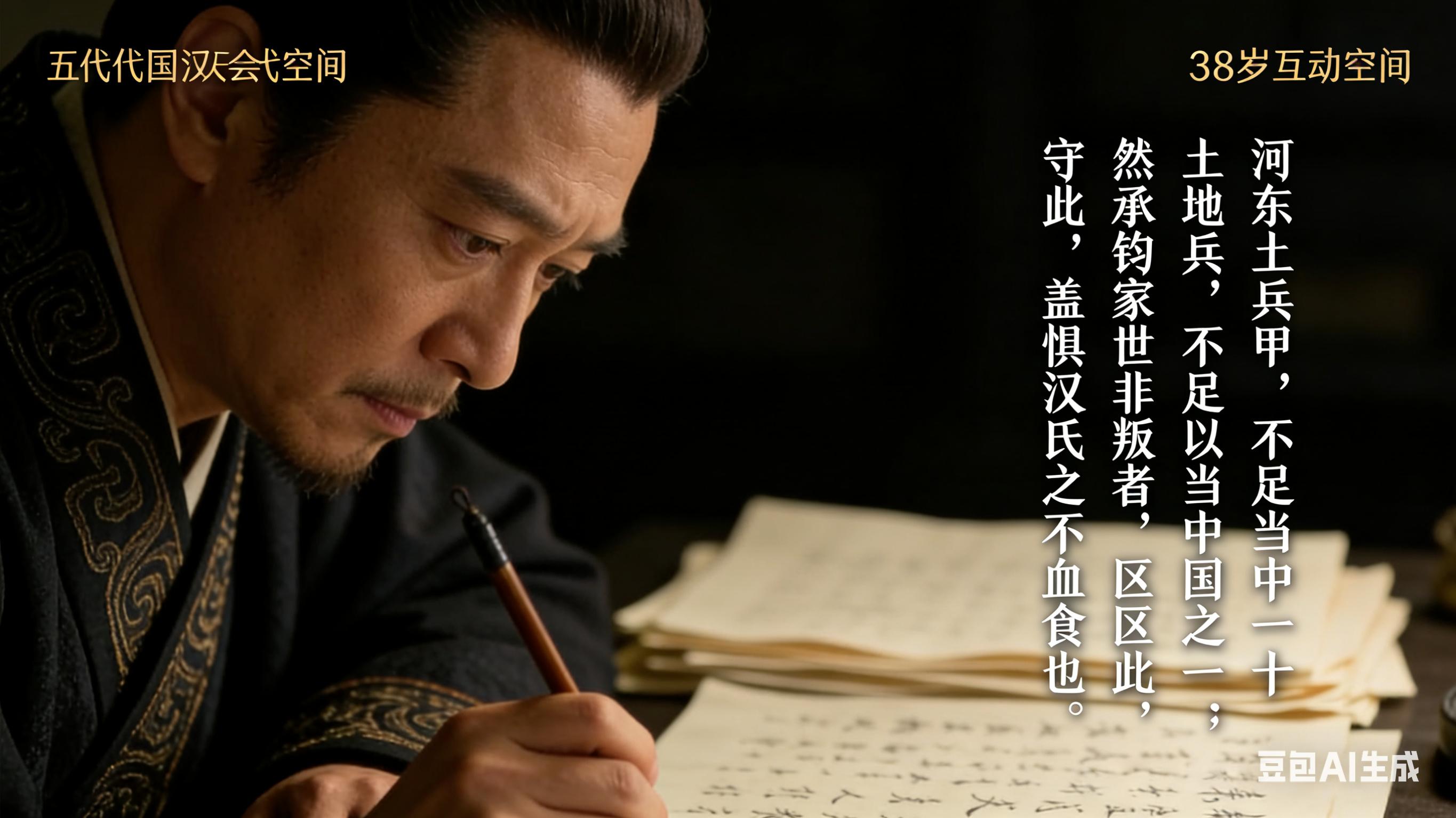 他曾在给宋太祖赵匡胤的书信中,写下满心无奈:“河东土地兵甲,不足以当中国之十一;然承钧家世非叛者,区区守此,盖惧汉氏之不血食也。”写下这段话时,他独坐书斋,窗外风雨交加,灯影摇曳,眼中满是坚守与无奈。他不是没有骨气,不是甘愿受辱,而是以个人尊严为代价,换取北汉的存续,只为让“汉”的国号,在乱世中多留存一日,让汉家宗庙不至于断了香火。这份隐忍,是乱世中小国君主的无奈,更是他身为刘氏后裔的责任,绝非单纯的懦弱。