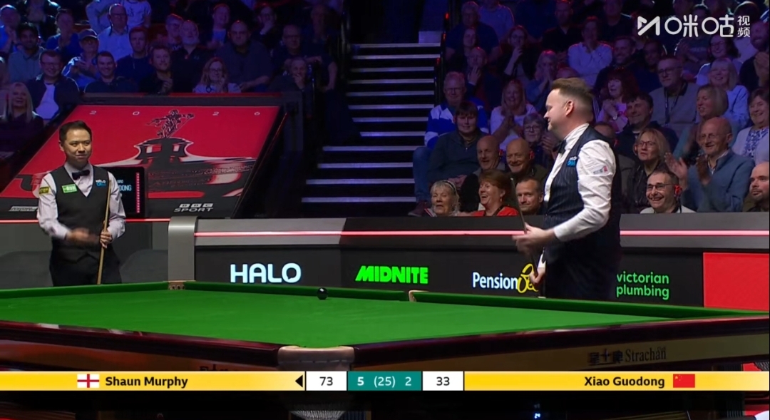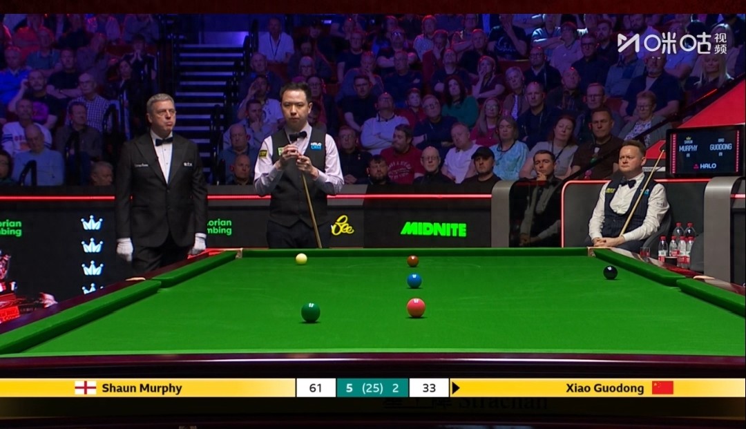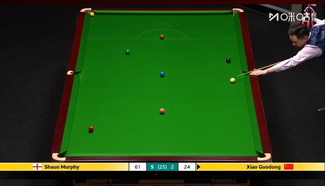 北京时间4月24日,CCTV,央视网频道,咪咕视频正在全程直播斯诺克世锦赛第二轮比赛,肖国栋对阵墨菲第二阶段比赛,第一阶段墨菲6-2暂时领先!