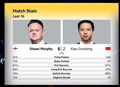本场比赛采用规则25局13胜制,第一阶段比赛,肖国栋率先上手打到6分,转换防守,墨菲迅速找到上手机会,墨菲两次上手80-7率先拿下第一局,墨菲率先上手一杆致胜单杆79分拿下,第3局,墨菲长台进攻打进拿到5分转换防守,肖国栋做斯诺克防守,墨菲解球被罚了28分,连续7杆没有解到,墨菲再次上手轰出单杆破百108拿下,第四局,墨菲打出单杆63总分71-16拿下,双方进入局间休息,第五局,墨菲打出单杆64分再下一局取得5-0领先优势,随后肖国栋连下两局追到2-5,第8局,墨菲打出单杆61再下一局,第一阶段墨菲6-2遥遥领先肖国栋。