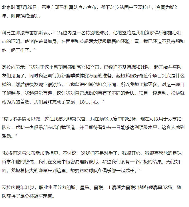 官方:瓦拉内加盟意甲升班马科莫 携手法布雷加斯重塑成长