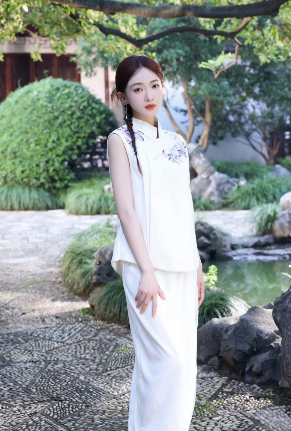 出演过多部古装剧的吴谨言,最适合的还是有东方韵味的新中式服饰,白色无袖新中式上衣,搭配同色系半身裙,让她看起来散发传统美女的魅力!。