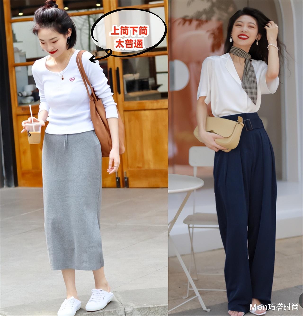 最好的解决方案是采用上浅下深或者上深下浅的搭配方式,比如上面黑色,下面白色,或者上面深的彩色,下面浅的基础色。这样不仅能让整体造型看起来更有层次感,还能起到提亮肤色、增加精神感的效果。在春季,一件深色系的上衣搭配浅色系的裤子或裙子,既应景又时髦。