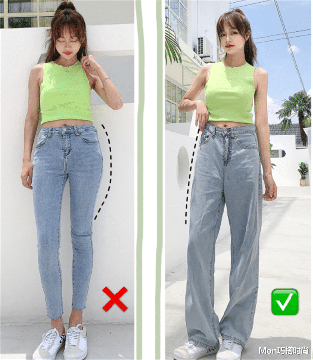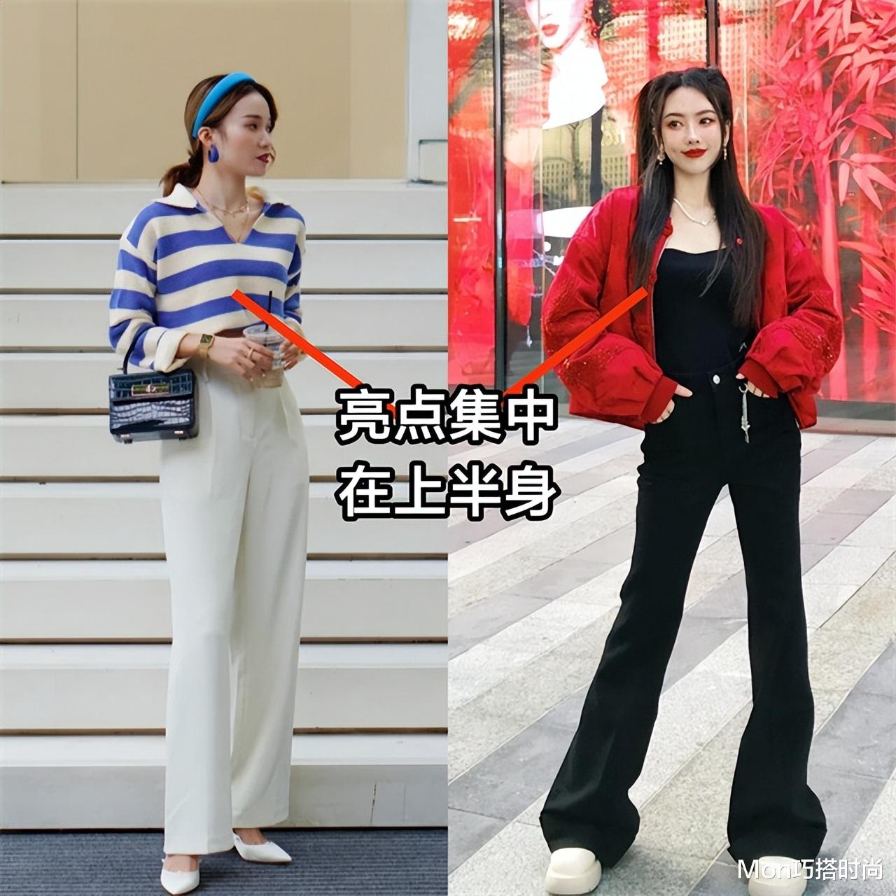 01重塑比例:上短下长往往和上紧下宽联合上紧下紧的搭配,真的是显矮星人的大忌,因为这样的搭配会让整体看起来不协调,而且比例也会不对。仔细观察就会发现,紧身的下装一般不会到脚踝下,这就容易让双腿看起来截断了,显得更短。如果由小脚裤变成阔腿长裤,盖住鞋面,配上一件短款上衣,整一个就是上短下长的完美结合,能够有效重塑身体比例,让腿型显得更加修长。
