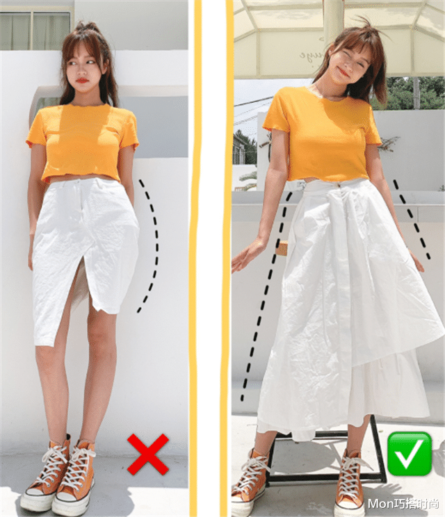这个技巧不只适用于裤子,裙子也一样,上衣是短的,下装的半身裙就得是踝上长裙,这样才能打造出黄金比例。
