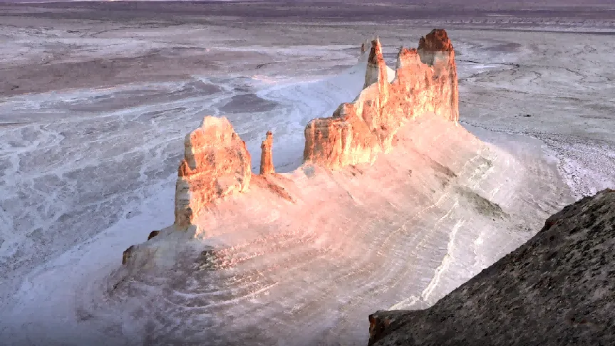 如果说基兹尔库普是大地的甜点,那么博兹吉拉则是这片土地最深沉的咏叹调。作为哈萨克斯坦的“必打卡之地”,博兹吉拉以360度全景环绕的地貌奇观,给歌手们带来了前所未有的视觉冲击。那座被当地人称为“船”的白色岩峰在荒野中孤独矗立,如同一艘搁浅在干涸海床上的远古巨舰。歌手们在悬崖峭壁间感叹:“站在风化的天然雕塑前,你会突然明白,人生其实是一片旷野,我们需要的只是自由地呼吸。”