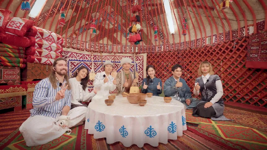 歌手们脱鞋踏入博物馆的复原毡房,仰望被称为“尚勒拉克”的天窗,那是游牧民族仰望星空的眼眸。五彩的穗字“沙沙克·巴乌”寄托着家族兴旺的期许,而用来存放餐具的“可尔麦”挂袋,被塞尔维亚歌手王子笑称为“传统冰箱”……这个小小的“移动家园”每一个细节都蕴含着游牧民族对自然的敬畏与适应。