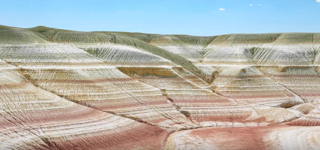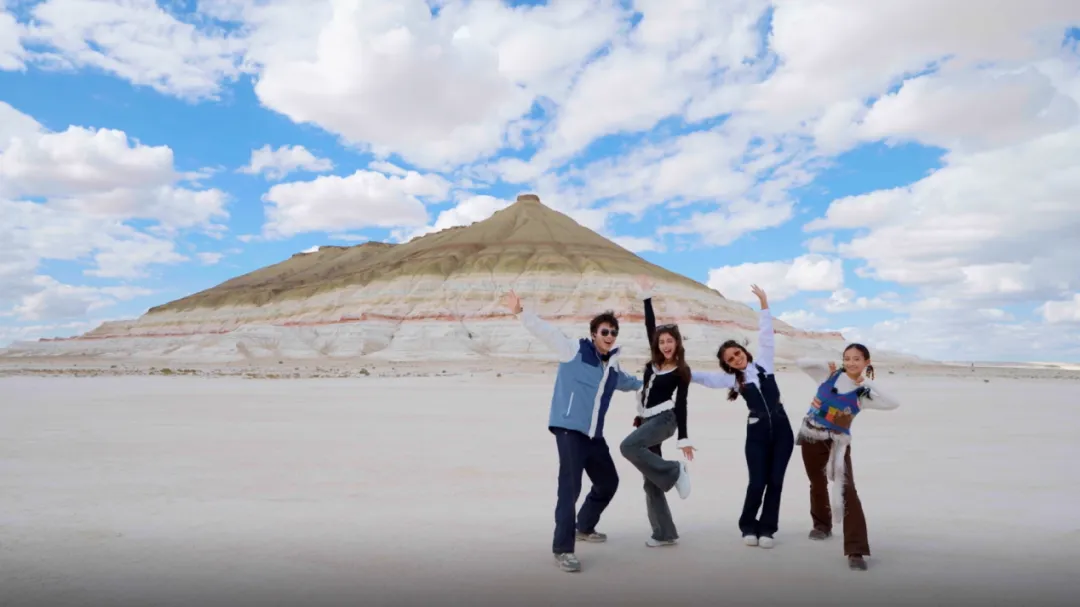 这里是大自然用亿万年时光雕琢出的“外星世界”。歌手们首先抵达的是印在哈萨克斯坦千元纸币上的博克蒂山,当地人称它为“大地的彩虹伤疤”。这里2亿年前曾是一片古海洋,如今裸露的岩壁记录着沧海桑田的变迁。镜头捕捉到了歌手们蹲在地上,像孩子一样兴奋地寻找着鲨鱼牙齿化石和浮游生物化石的瞬间。这种在无人区与远古生命对话的体验,让歌手们感叹:“踩在这片土地上,感觉自己无比渺小,风声就是最原始的音乐。”