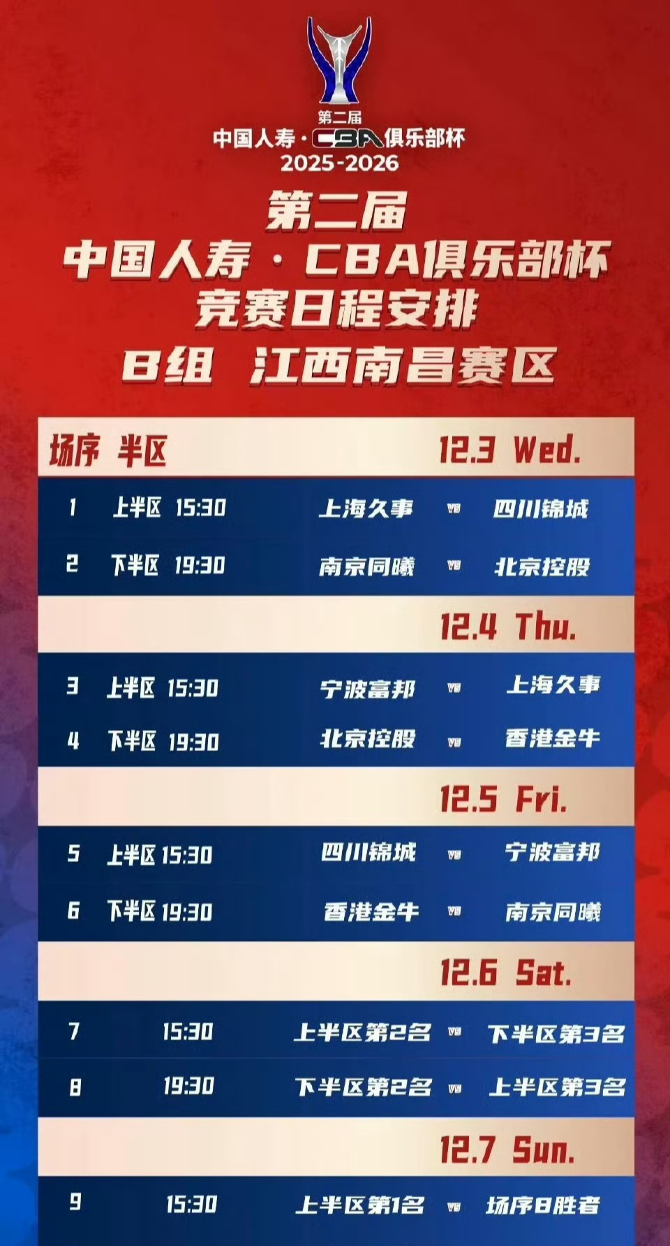 B组两场,15:30分宁波男篮对阵南京同曦男篮,他们之间的胜者,将于7日对阵北控男篮。19:30分香港金牛对阵四川男篮,他们之间的胜者将于7日对阵上海男篮。
