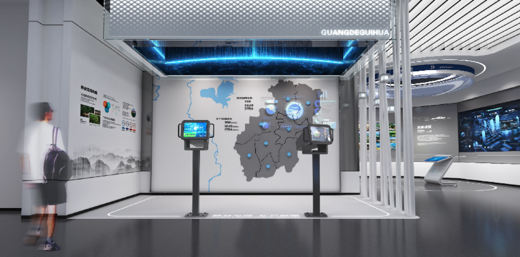 广德规划馆的“璀璨华章 奋进广德” 展区,独特的AR射屏互动装置,可供观众参与体验并了解广德市内林业空间布局与矿产资源规划等内容,让展示成果更具冲击力。