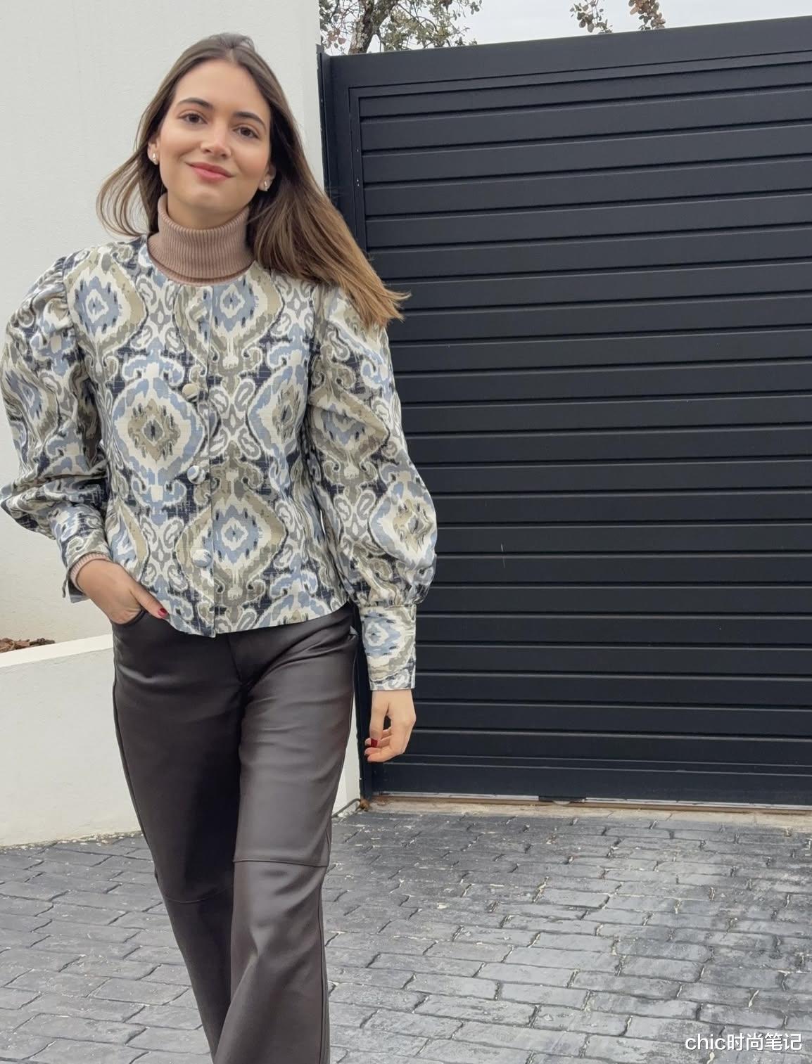 印花图案的圆领外套搭配卡其色高领毛衣,棕色皮裤的加持自带复古感,上半身复杂,下半身就简约,中和成穿搭的精髓。