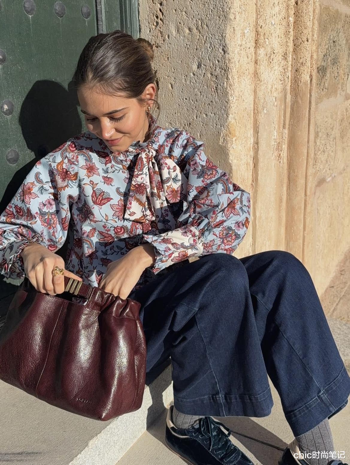 复古花色衬衫做了蝴蝶结和泡泡袖的设计,复古且优雅,搭配酒红色包包和深蓝色牛仔裤,休闲又百搭。