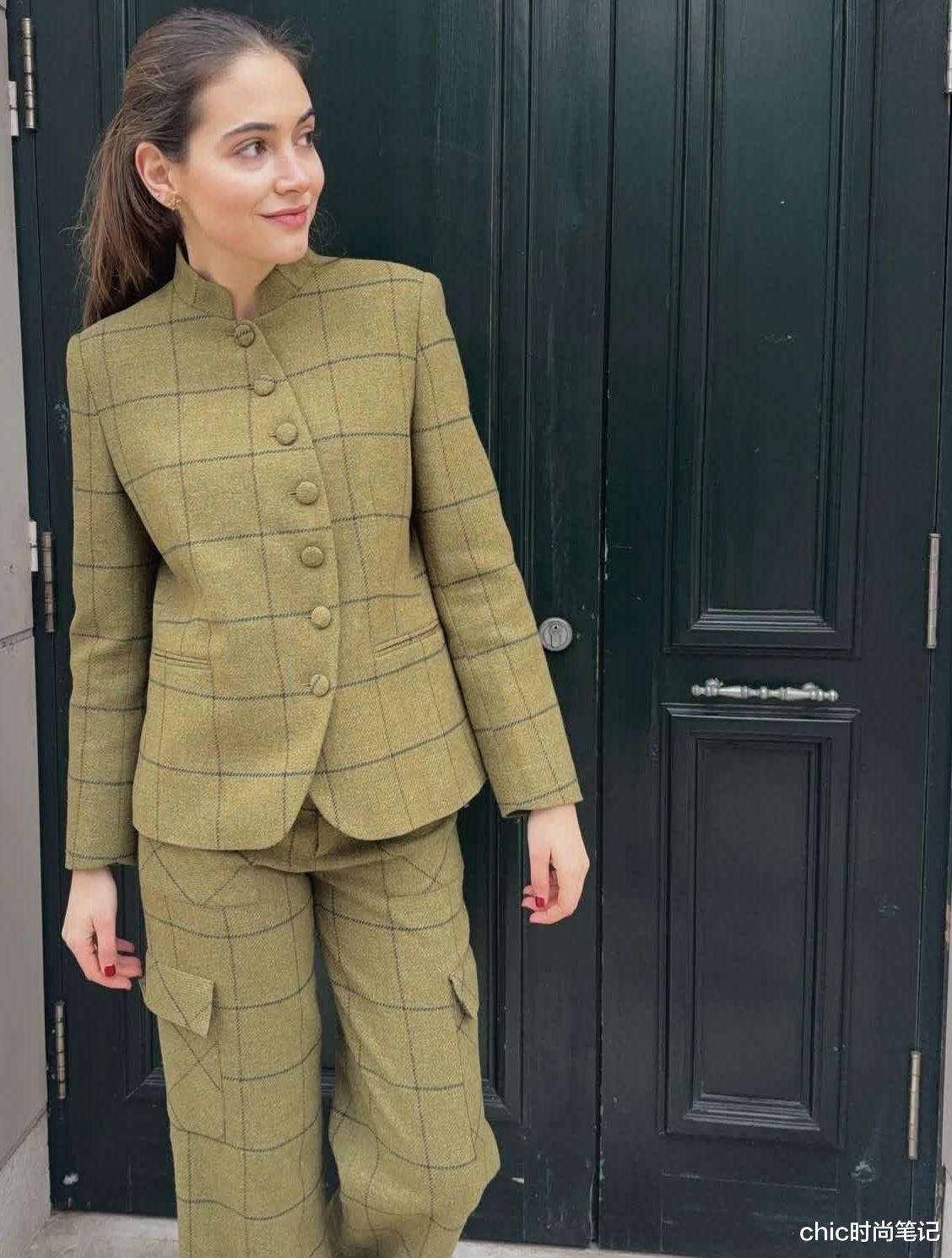 呢子或者羊绒面料自带高级感,深色系的格子套装沉稳而内敛,与法式穿搭的氛围十分相搭。圆弧形的剪裁不会过于板正,多了些松弛和休闲。