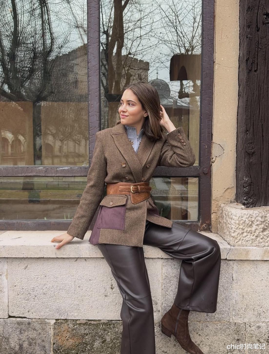 进阶版的穿搭则可以在羊绒西服外套上叠戴一条腰封,最好也是选择大地色系的,色彩上会更加和谐,下身选择质感好的棕色皮裤,整套穿搭摩登又优雅,有老钱风那味儿了。