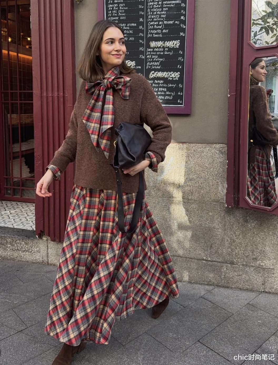 红黄棕组成的格子连衣长裙很有节日氛围感,适合圣诞、元旦、春节等节日穿搭,略显浮夸的蝴蝶结系带俏皮且灵动,配上棕色或者深色的外搭又能突出穿搭重点。