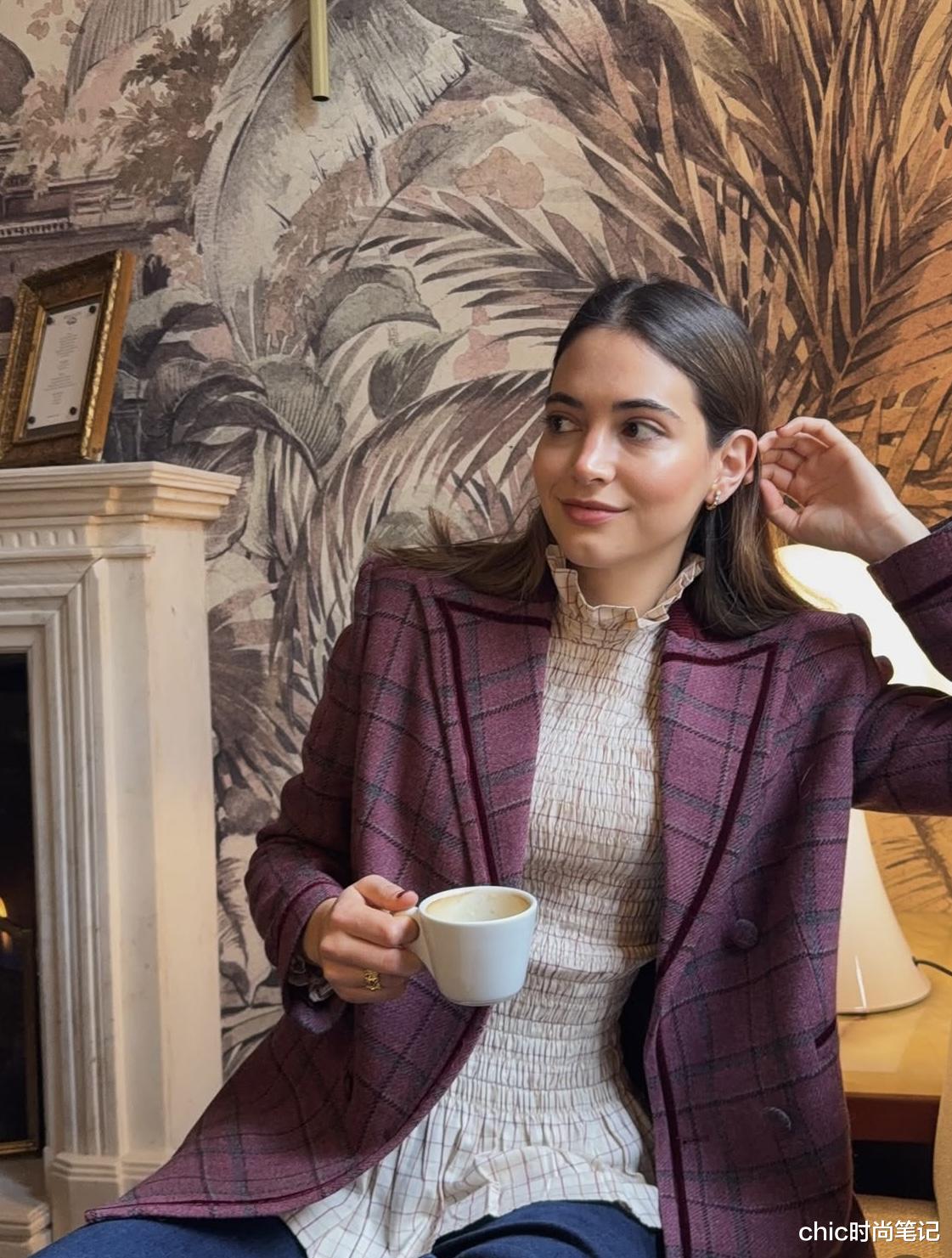 法式是少不了格纹元素的加持,一件基础款的呢子西服外套,用格纹图案稍加设计就很有复古感。内搭高领褶皱衬衫,深色外套配浅色内搭,经典的选择。