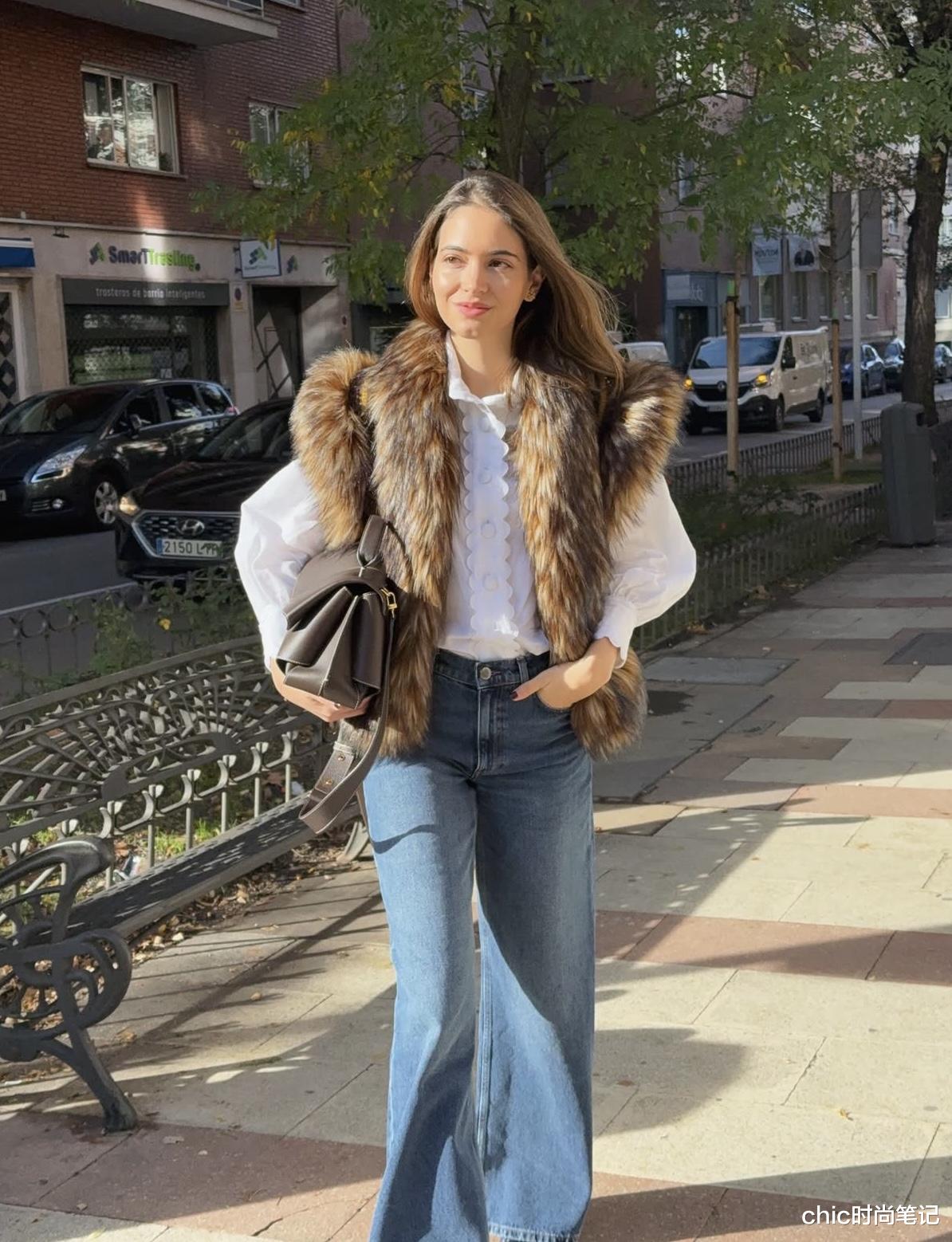 白色衬衫的设计充满浪漫元素,蕾丝边。泡泡袖、羊角袖收口、波浪纹等元素的加持,让衬衫变得精致而重工,搭配浅蓝色阔腿牛仔裤,不费力的松弛与高级。再点缀上一件棕色皮毛披肩,直接拿捏时尚look!