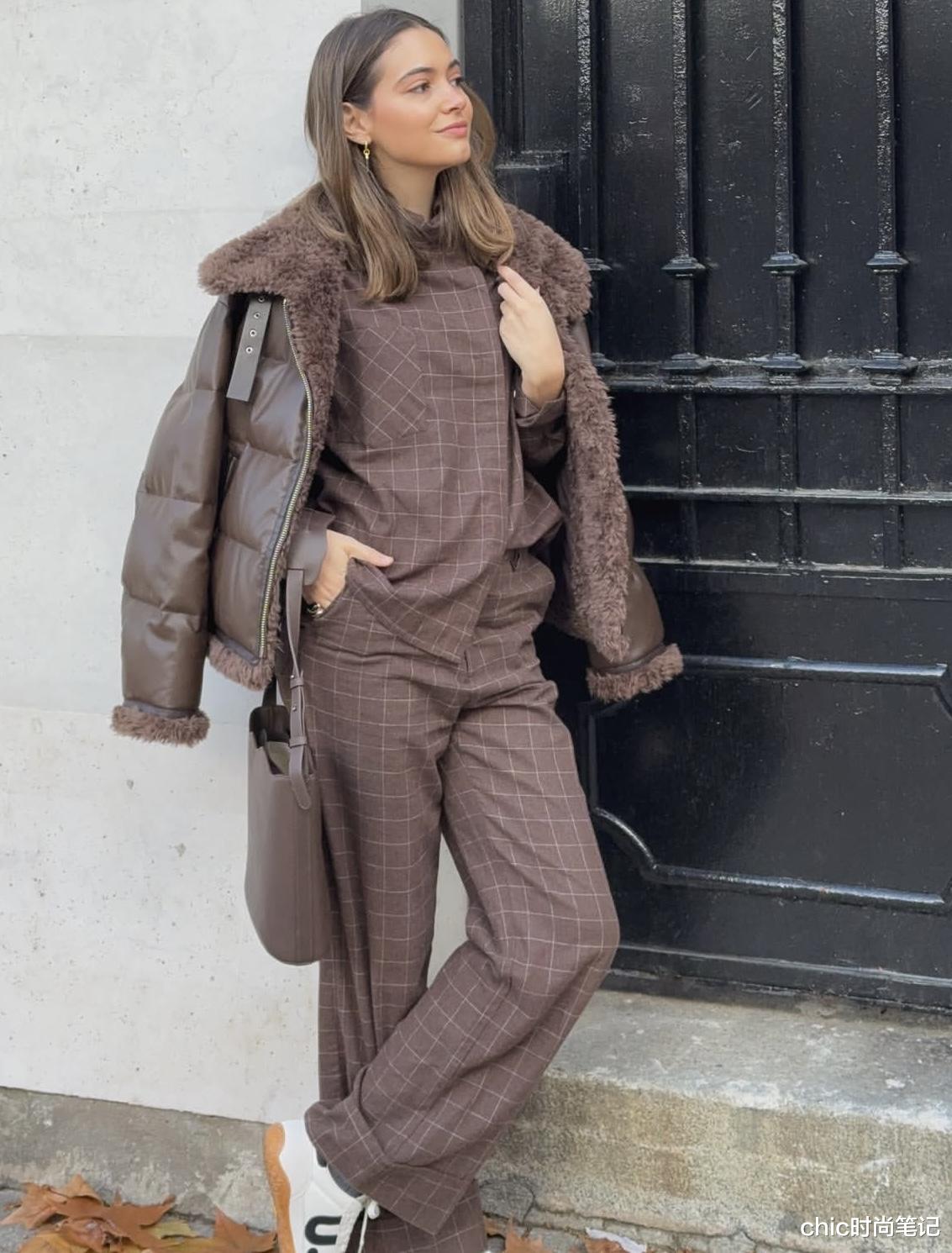 没有多余的配色,哪怕只有单色系也能穿出高级感,棕色格纹套装休闲感十足,外搭同色系棕色皮毛一体机车服外套,把风度与温度的完美把握使得穿搭更加实用与立体。