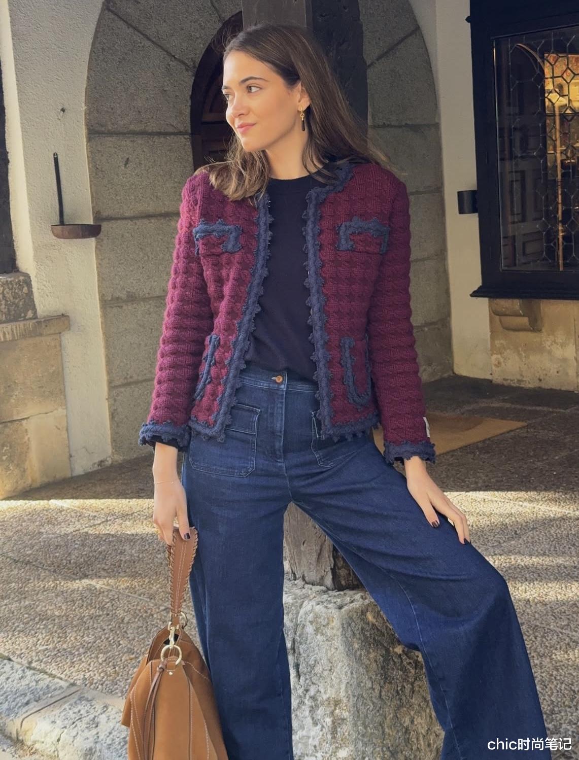 酒红色+藏蓝色小香风设计的毛衣开衫满满的复古感,搭配高腰牛仔阔腿裤,把休闲与精致有效结合在一起,再配上麂皮或者丝绒包,色彩统一即可。