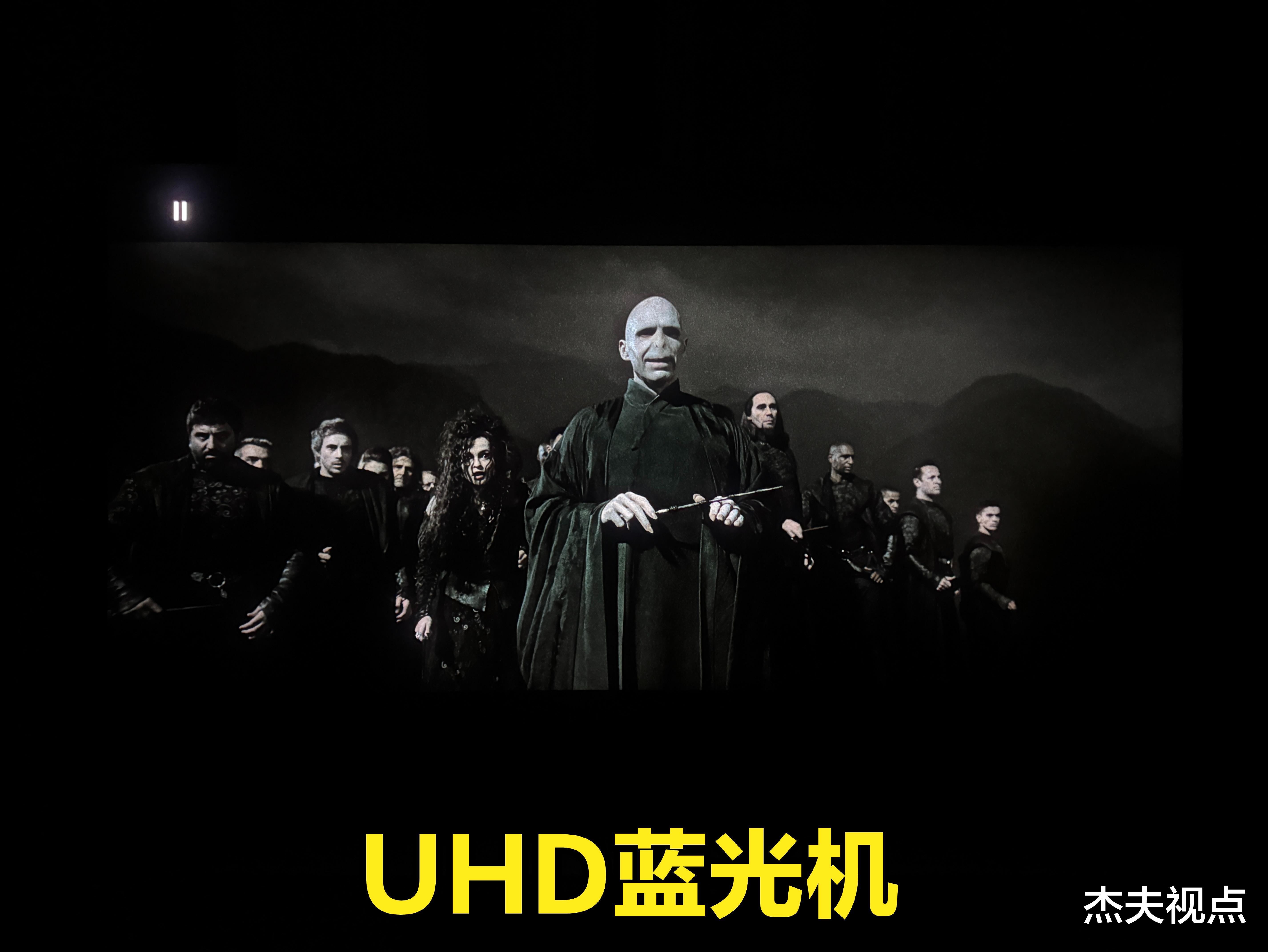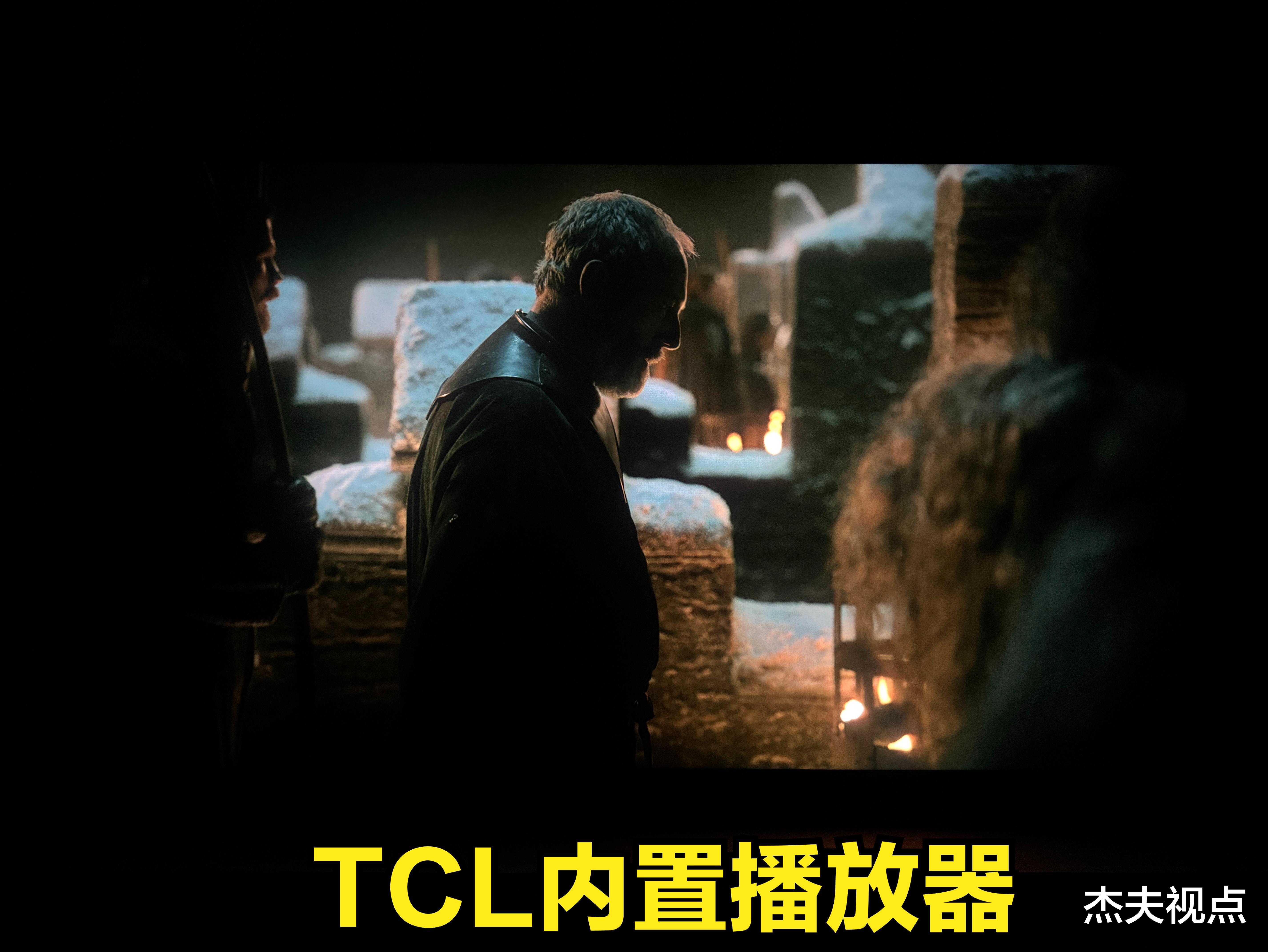 《权力的游戏》中,在TCL内置播放器上,暗场的噪点略多点点,而在4K蓝光机上,暗场的噪点较小,整体观感会相对柔和一些。不过这种差异并不太明显,我们觉得至少在观看视频的时候没有感受出来,屏摄会仔细对比才能看到4K蓝光机少许的优势。当然权游还算是相对较新的内容,等下我们可以看到在一些杜比视界4K老片子上,这部分的区别会更为明显一些。