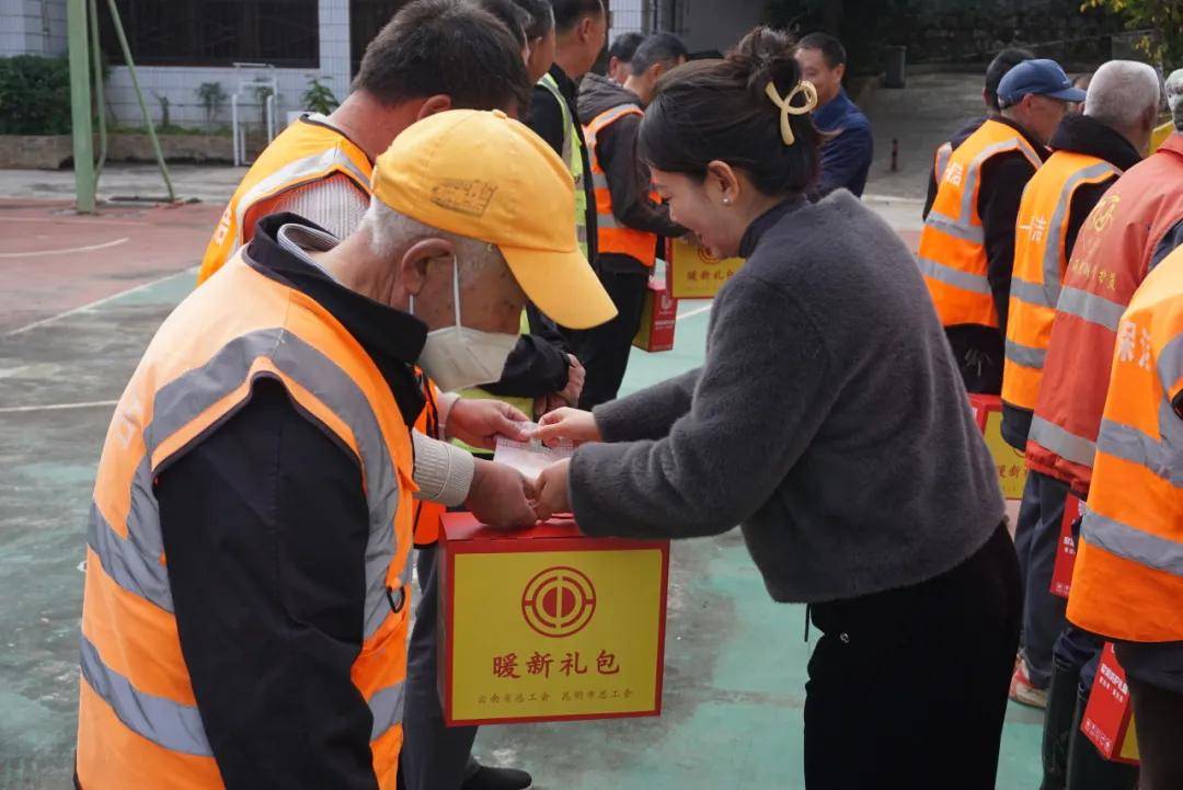 此次慰问活动由区党工委委员、云南七甸产业园区党工委副书记、区党群工作部部长、区总工会主席徐敏带领慰问组分别在七甸、汤池、阳宗三个镇街道开展。慰问现场,慰问组逐一将暖“新”礼包送至环卫工人手里,并详细询问他们日常工作强度及健康状况,反复叮嘱大家在户外作业时注意自身安全,做好防风防冻防护,鼓励大家遇到急难愁盼问题及时向工会反映,工会将全力为职工排忧解难。同时,希望环卫工人继续发扬“不怕苦、不怕累、不怕脏”的奉献精神,立足本职岗位,扎实开展工作,为打造更加美丽宜居的村庄环境贡献力量。七甸街道的环卫工人说,“感谢工会给我们送来的关怀,收到这份暖‘新’礼包,心里暖暖的,我们干活也更有劲了”。