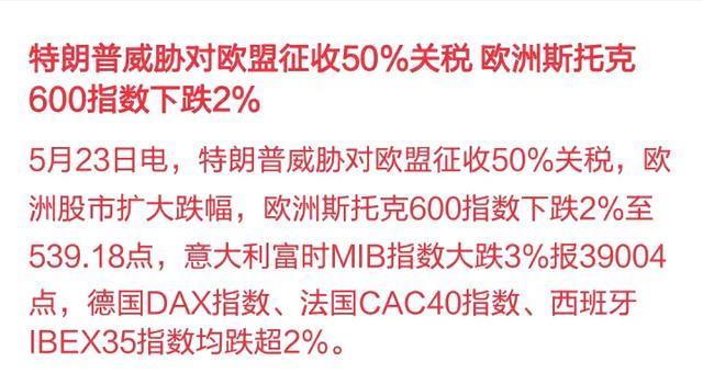 今天(2025年5月23日),欧美股市集体暴跌,欧洲斯托克600指数跌2%,德国、法国、意大利股市跌