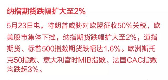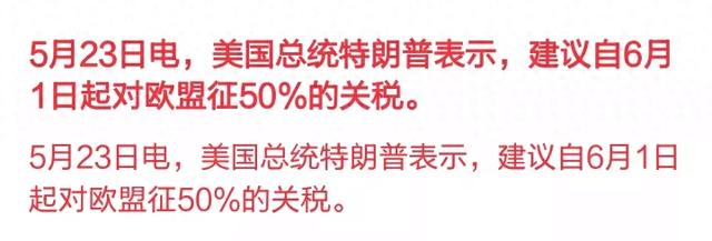 导火索:特朗普的“关税炸弹”!美国总统特朗普突然宣布,计划从6月1日起对欧盟商品加征50%关税!这一消息直接吓崩市场,投资者担心美欧贸易战全面爆发。