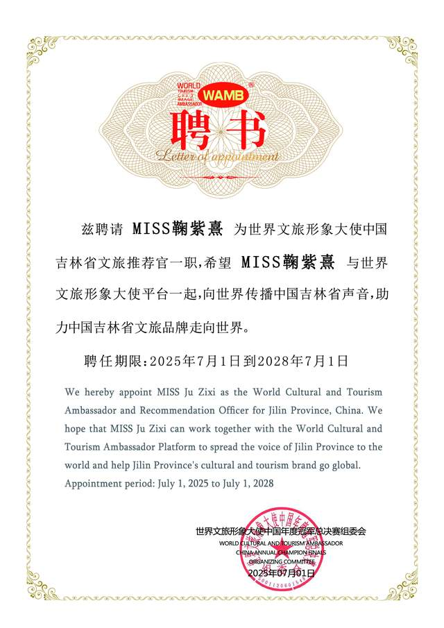 世界文旅形象大使中国年度冠军总决赛组委会对鞠紫熹颁发的文旅推荐官聘书,自2025年7月1日正式生效,组委会于本日面向全网发布本聘书时,鞠紫熹即可履行世界文旅形象大使中国吉林省文旅推荐官的相关义务。