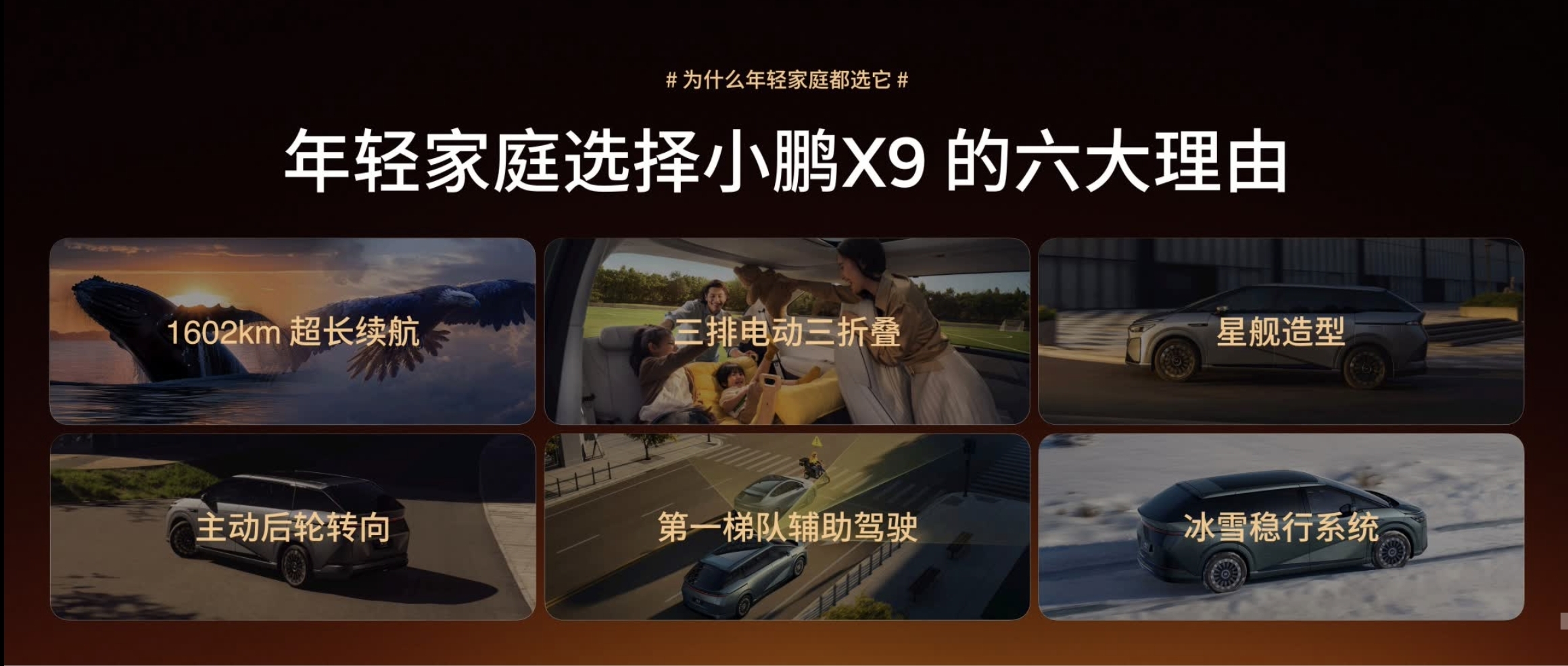 总结下来年轻家庭选择小鹏X9有六大理由:1602km超长续航、三排电动三折叠、星舰造型、主动后轮转向、第一梯队辅助驾驶、冰雪稳行系统。