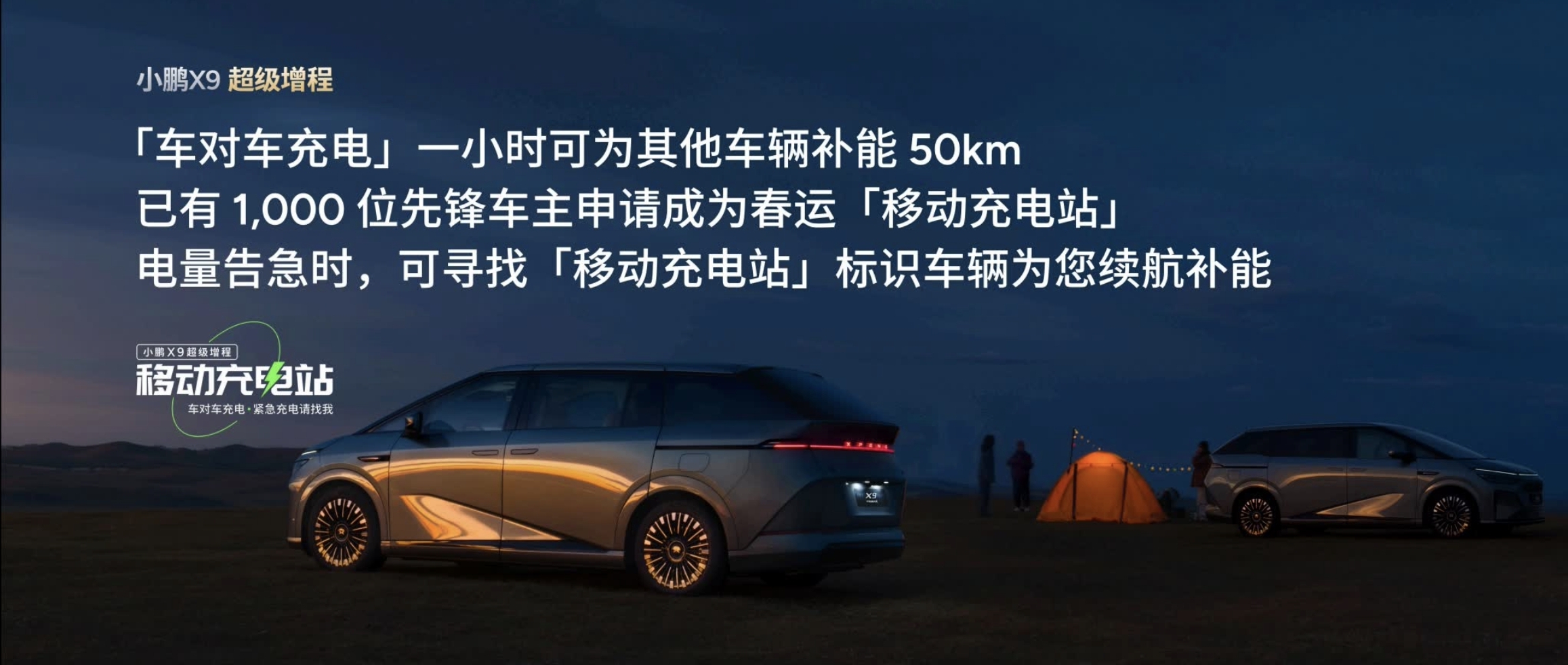 X9超级增程还是同级唯一有6kW的V2L、V2V对外放电功能的车,1小时可为其他车辆补能50km。今年春节如果你车没电了,要排长队充电,那么看到有下面“移动充电站”标志的X9超级增程,那你可就有福了,因为它可是你的“移动充电站”,已经有1000位小鹏X9超级增程车主申请成为春运“移动充电站”了!