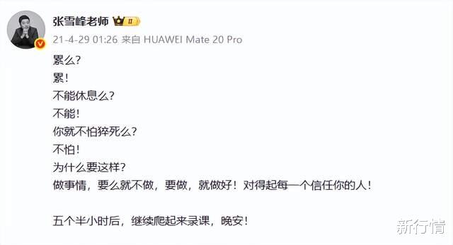 高强度工作下,他在朋友圈里记录过自己的生活节奏:“累么?累!不能休息么?不能!你就不怕猝死么?不怕!……五个半小时后,继续爬起来录课,晚安!”