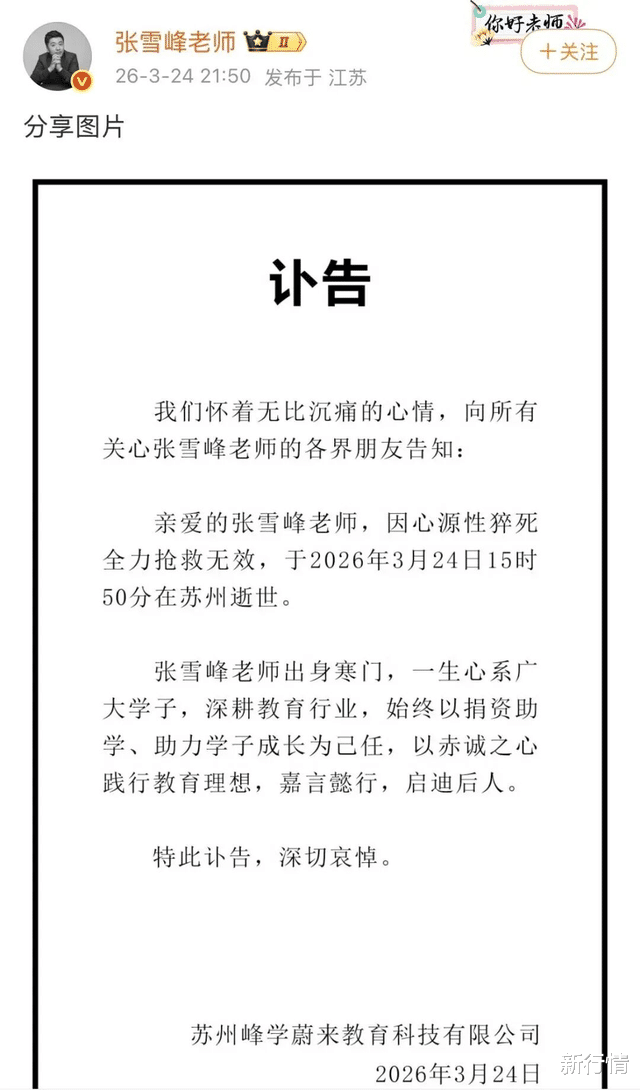 一夜之间,张雪峰多个社交平台账号头像变成了黑白,那个说话直白、言辞犀利的男人,就这么倒下了。