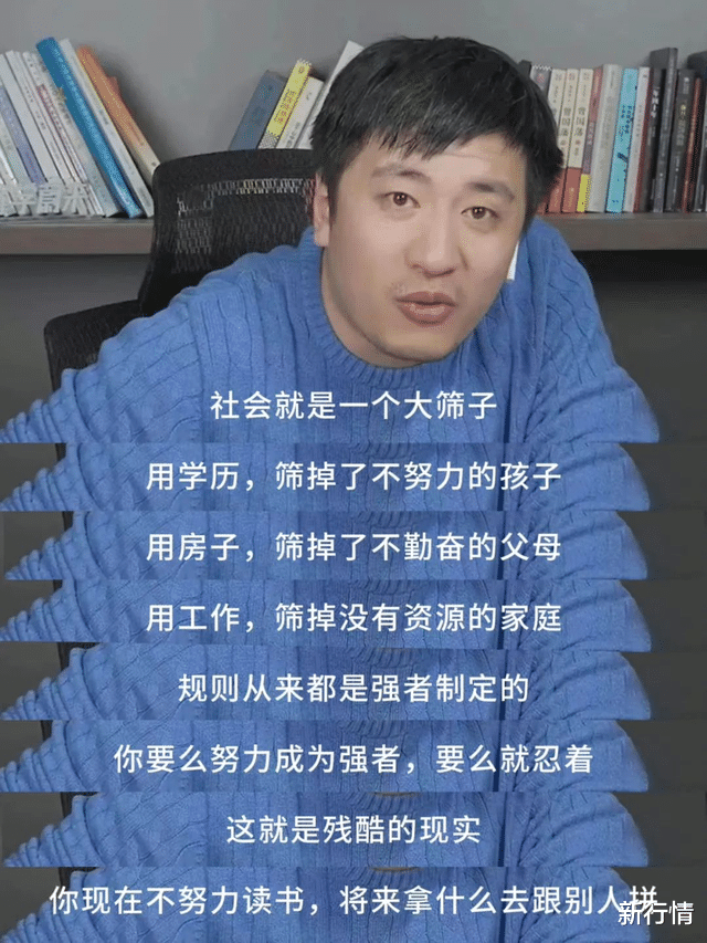 比如,“社会就是一个大筛子,用学历,筛掉了不努力的孩子,用房子,筛掉了不勤奋的父母,用工作筛掉没有资源的家庭,规则从来都是强者制定的,你要么努力成为强者,要么就忍着,这就是残酷的现实,你现在不努力读书,将来拿什么去跟别人拼。”