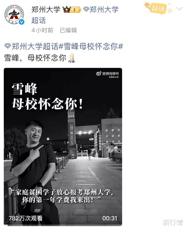 今日,张雪峰母校郑州大学发文悼念,感谢张雪峰多次返校与师生交流,并捐赠设立“峰学蔚来助学金”,用以资助家庭经济困难学生。