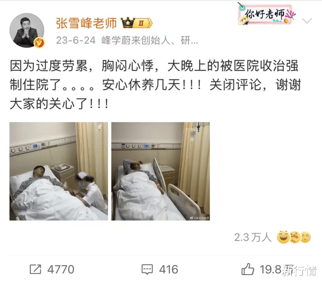 早在2023年6月,他就曾因过度劳累导致胸闷心悸被医院强制住院,诊断结果为慢性疲劳综合征。当时,他在社交平台发文:“因过度劳累,胸闷心悸,晚上到医院急诊……被医院扣留,必须住院观察。”